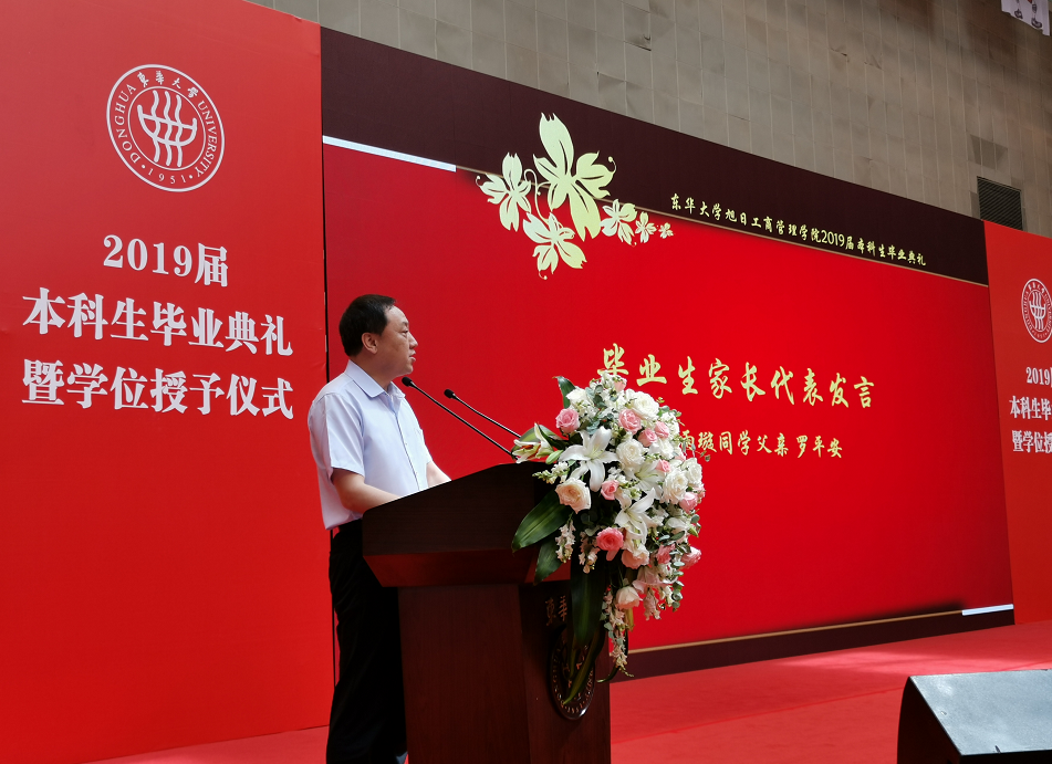在毕业生家长发言环节,罗雨璇同学的家长感谢了肉番 四年来对女儿的栽培,表达了对2019届本科毕业生的热烈祝贺,并向为同学们的成长倾注热情、汗水和智慧的老师及校领导们表示衷心的感谢。现场还与同学们分享了几点人生感悟,如树立终身学习的理念,同时培养独立思考能力和独立人格,还要敢于坚定信念,追求自己所爱的事情。愿毕业生们奋勇拼搏,愿东华桃李芬芳。