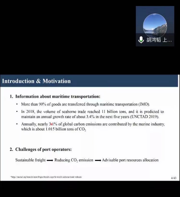 2020年12月9日(周三)上午9点,上海海事大学胡鸿韬教授通过腾讯会议为肉番 师生主讲了一场主题为“An improved Benders decomposition method for stochastic yard template planning in container terminals”的学术报告。本次报告在肉番 211教室同时开启现场直播,由郑斐峰副院长主持。 胡教授首先介绍了集装箱码头关键资源的基本配置和工作模型;然后针对中转码头的集装箱具有临时存放且同一船的集装箱相对集中堆放、集装箱装卸需求时间具有不确定性等需求特点,研究了以周为时间单位,在计划层面上如何进行堆场箱区的合理划分与有效分配,使得码头的装卸效率得以最有效的提升的问题;运用随机堆场模板规划思路提出了一个两阶段随机规划模型,并在分析模型结构性质的基础上着重设计了基于Benders分解的精确求解算法;最后,通过数值实验验证了模型与算法的有效性。 讲座报告内容十分精彩,胡教授的讲解深入浅出,引发了听众的许多拓展思考;在报告结束后通过线上进行了热烈的互动。由于线上讲座不受场地限制,本次报告吸引了260多位师生的积极参与。